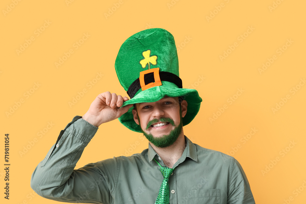 Young man in leprechaun hat with green beard on yellow background. St. Patrick's Day celebration