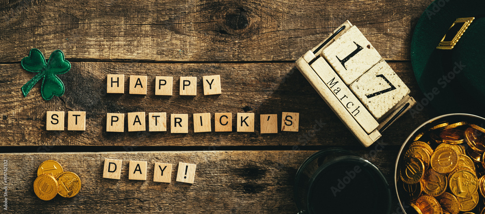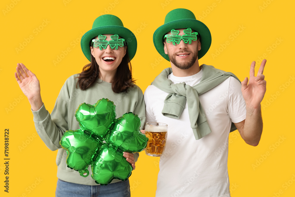 Beautiful young couple in leprechaun hats with air balloon in shape of clover and glass of beer on yellow background. St. Patrick's Day celebration