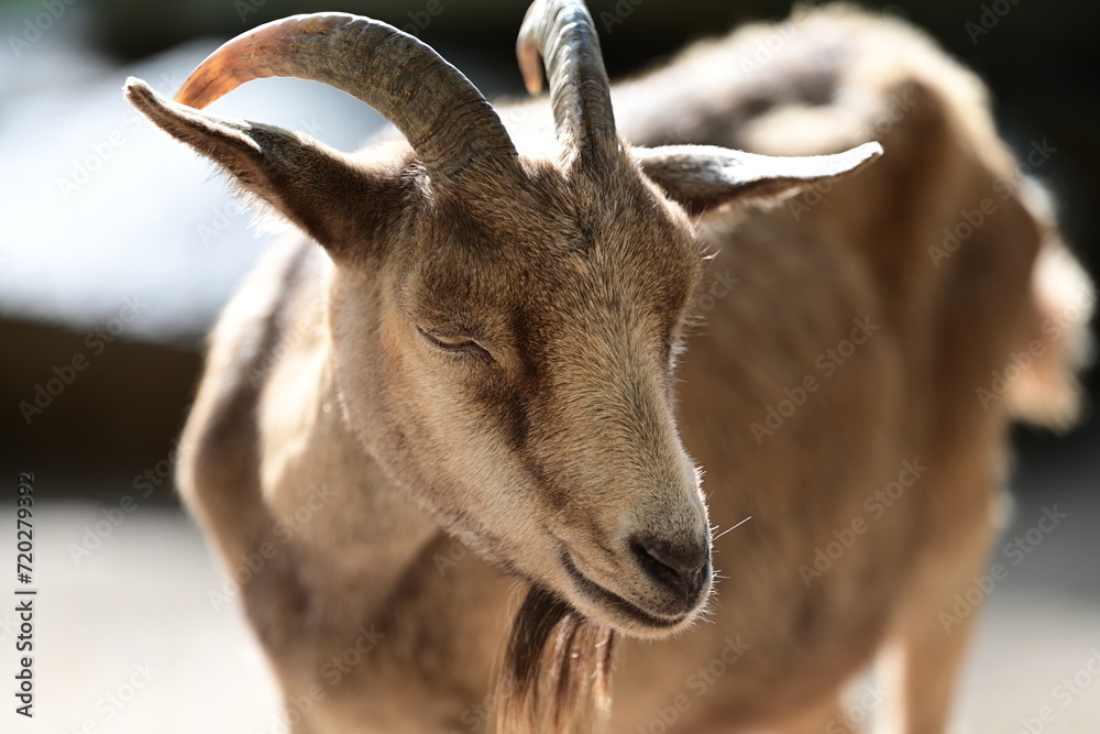 Schöne Ziege mit Hörnern in der Sonne, Detail