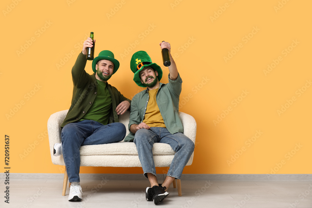 Young men in leprechaun hats with green beards holding bottles of beer and sitting on sofa near yellow wall. St. Patrick's Day celebration