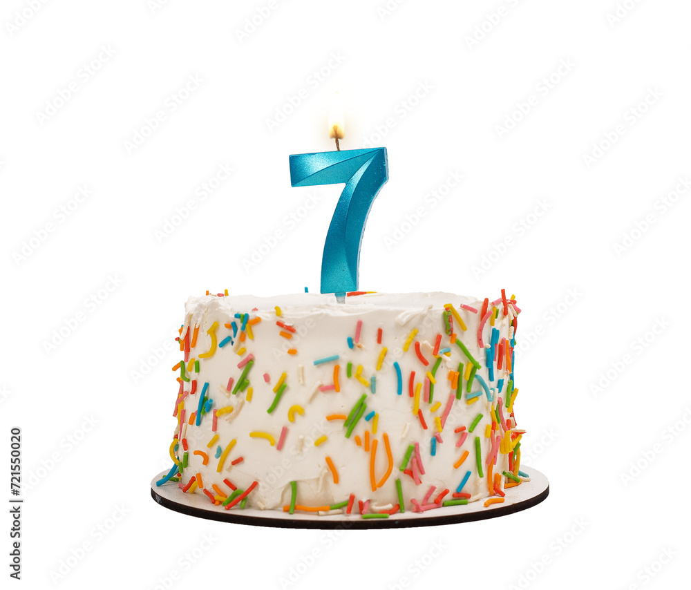 7 shaped candle light on happy birthday cake isolated on white background, transparent png