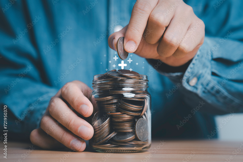 Businessman putting coin to saving jar with plus sign for money deposit savings to return dividend investment and interest growth concept.
