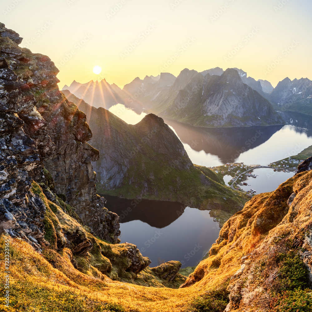 Heavenly light from the midnight sun over Reinebringen, casting a serene glow on the mossy landscape and distant mountains. Norweay, Lofoten Island (Square photo format)
