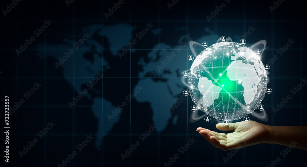 New global business connection concept. Businessman holding the global connection with connecting people orbit around the world. World map and connecting people background. World map illustration.