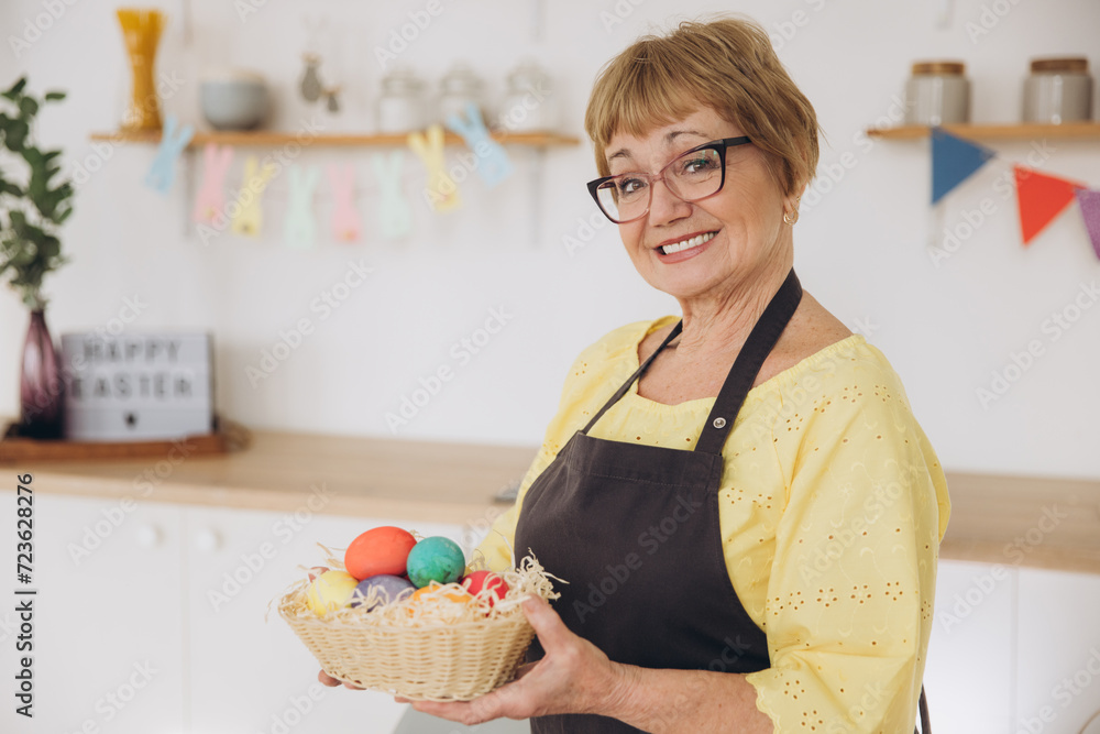 Happy Easter! Cute retired old woman painted easter egg. DIY craft easter eggs