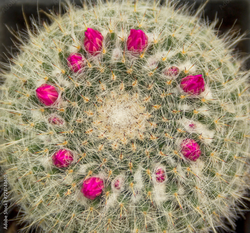 Ball cactus with pink flowers