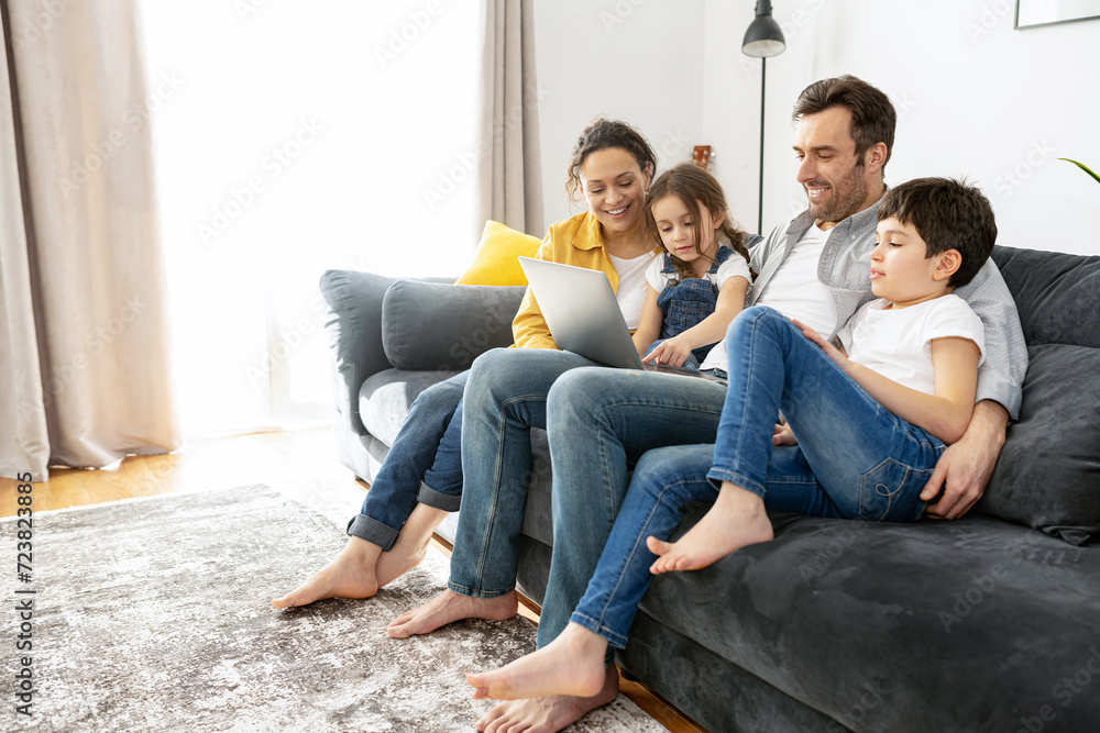Happy family of four using laptop sitting on the sofa in cozy apartment, parents and two kids talking with relatives, spends time on the weekend together at home