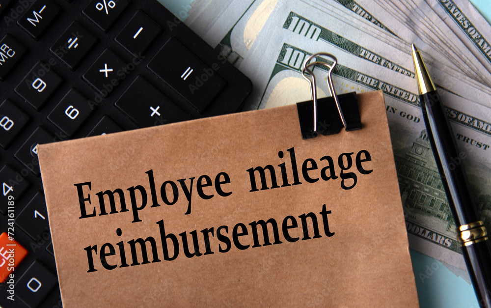 EMPLOYEE MILEAGE REIMBURSEMENT - words on brown paper on the background of calculator and banknotes