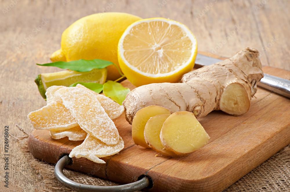 Fresh ginger root, candied ginger and lemon