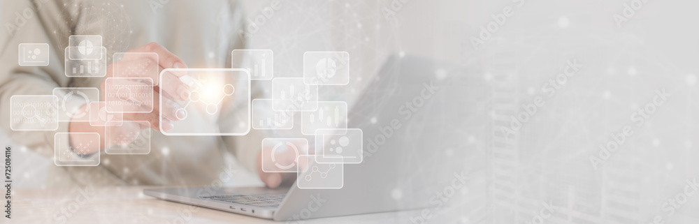 person use document planning the business plans and analyse profitability of working companies with digital augmented virtual graphics for project manager working on laptop and update business plan