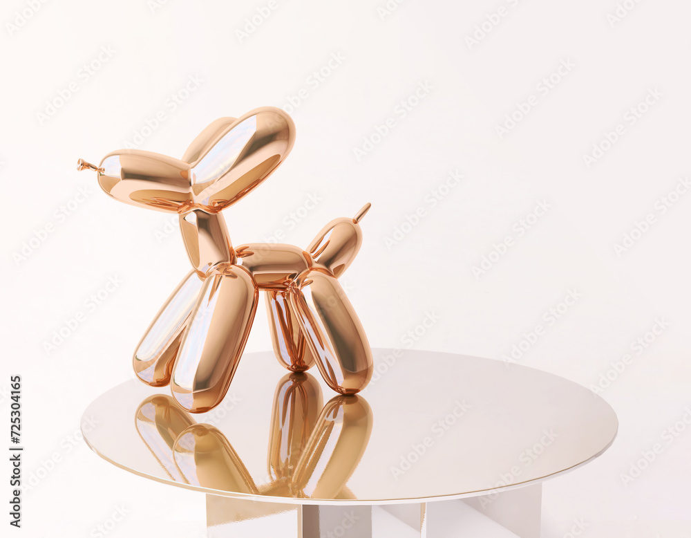 Modern design of chrome round podium table, gold balloon dog sculpture in sunlight, shadow on wall for luxury beauty, cosmetic, skincare, body care, fashion product display background 3D