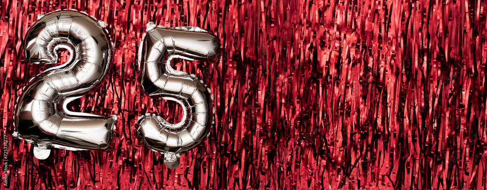 Silver foil balloon number twenty-five. Birthday greeting card with inscription 25. Anniversary celebration. Banner. Silver numeral on red background.