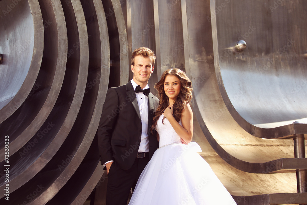 bride and groom under the metal ceiling