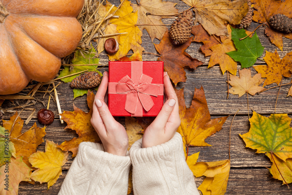 Female holding gfit box on a table.