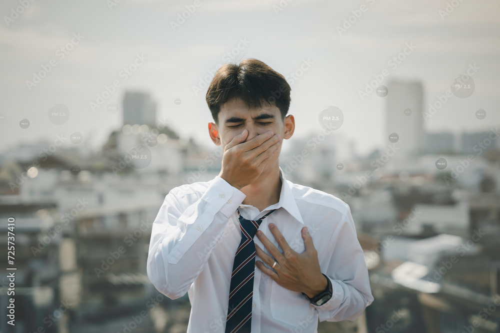 Air pollution quality of dust PM 2.5 is toxic and dangerous to health. Business man Protection unhealthy air pollution dust smoke in an urban city and smog with bad weather