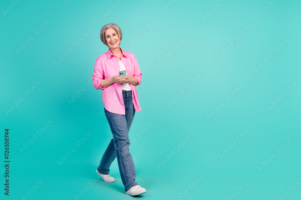 Full size photo of satisfied nice pensioner person walk to empty space with smartphone in hands isolated on turquoise color background
