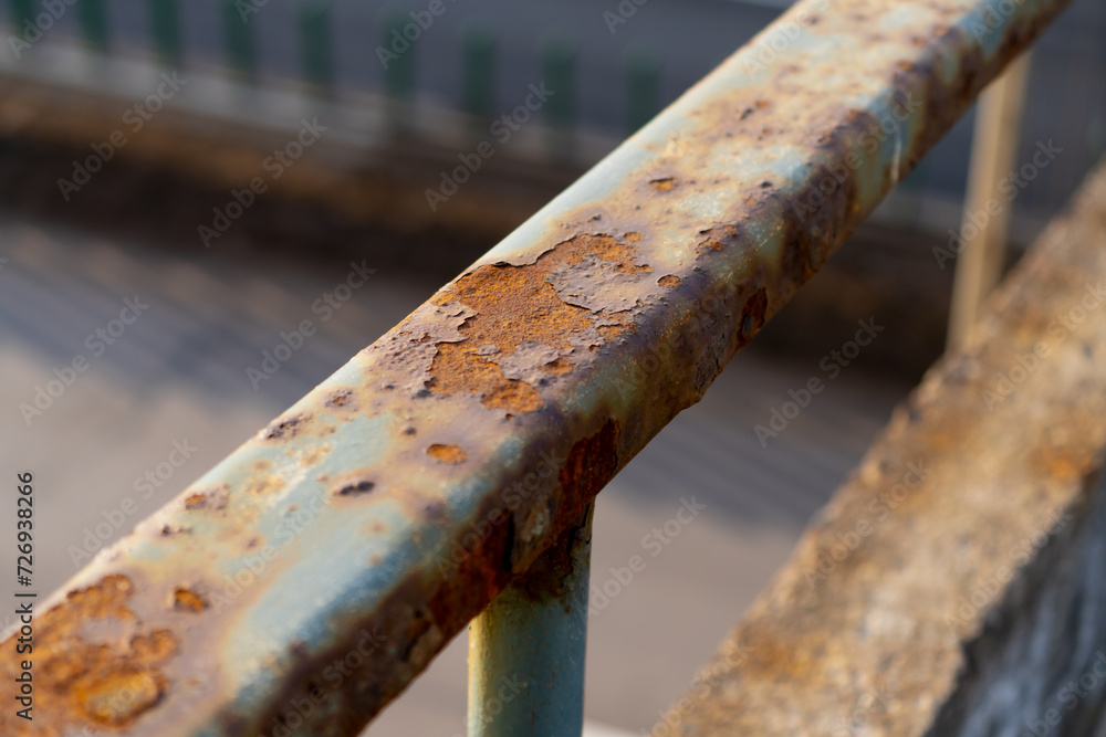 Rust made hole in painted hand rail outdoors and peeling of old color layer