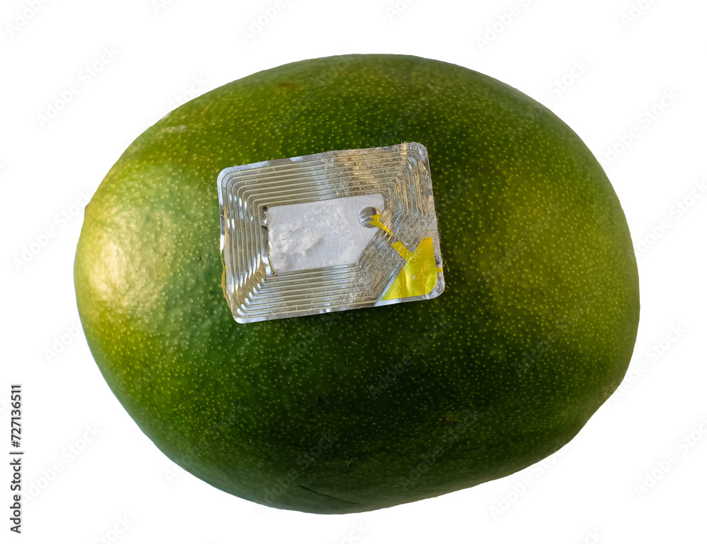 The used security tag or radio frequency security label is on the green mango fruit. Anti-theft concept.