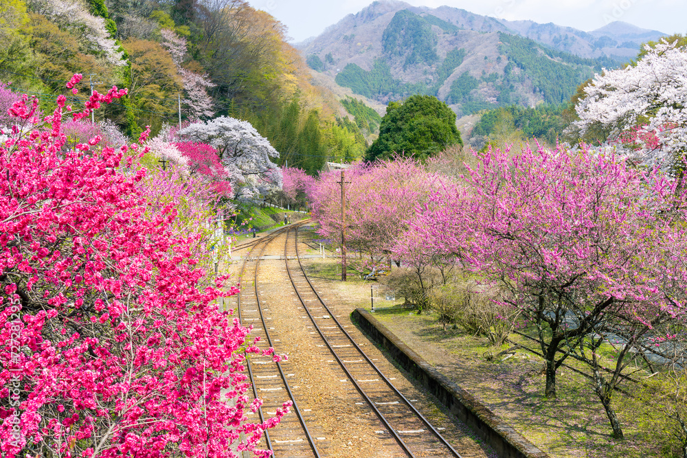 Beautiful railway with pink white and red blossom trees blooming along the railway tracks at Godo station in morning spring, Gunma, Japan.
