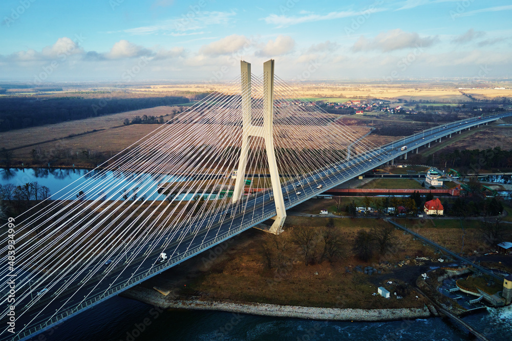 Cheerful man in white t shirt smiling and embracing adorable little child while standing in apartment and looking at camera against beige wall on background