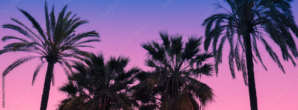 Palm tree against the sunset sky. Tropical evening landscape. Gradient color Horizontal banner