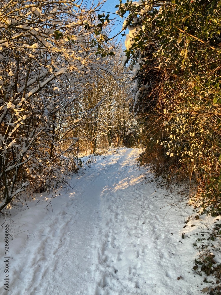 Landschaft mit Weg zwischen Bäumen im Wald mit Schnee im Winter