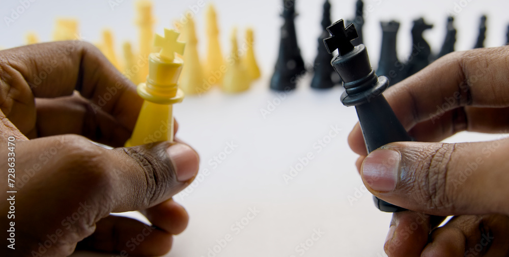 Close up of a man playing chess with the black king on the white background