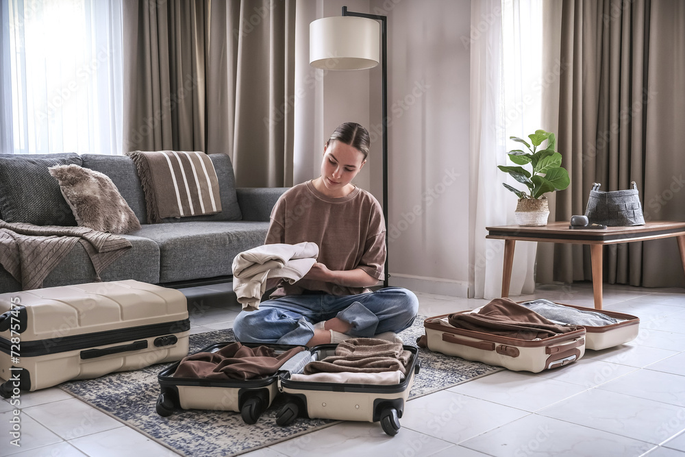 Travel,woman packing luggage in suitcase and planning solo trip eco friendly,travel banner and packing suitcase.