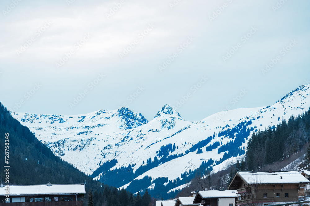 Beautiful snow-capped alpine mountain range with houses and trees in the valley below. The scene is serene and peaceful, emanating a sense of calm, the beauty and majesty of the natural world