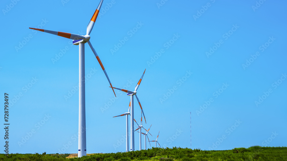 Wind generators on the highlands of Madeira island against the blue sky. Copy space.