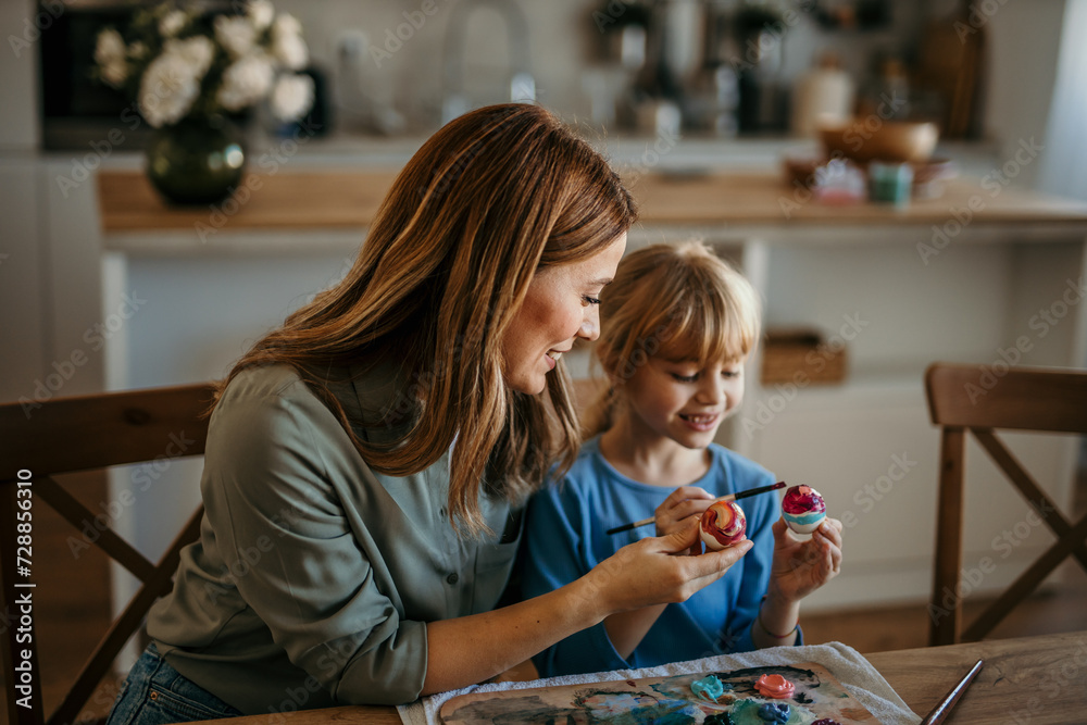 Joyful mother and daughter adding festive touches to their Easter celebration