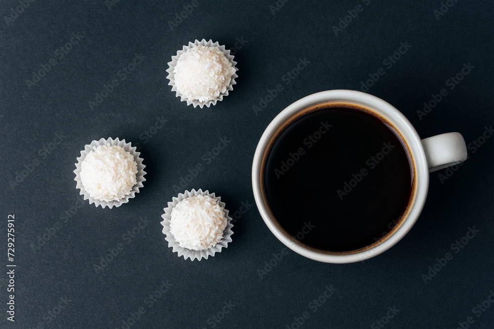 Coffee cup and coconut candies on black table. Top view, flat lay