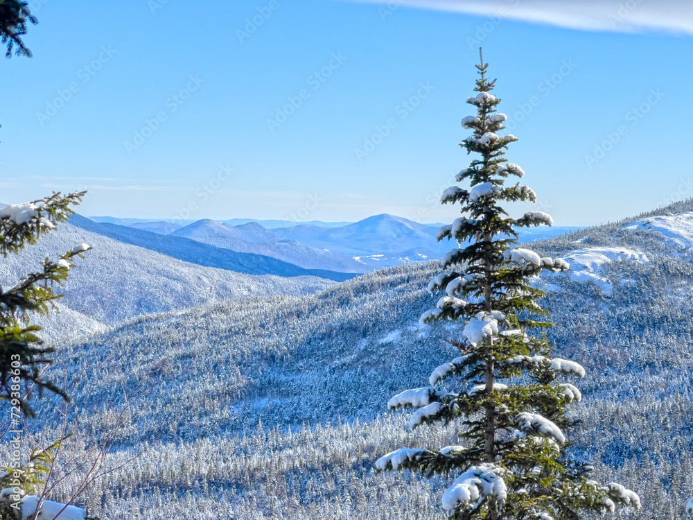 A snowy and winter landscape of the White Mountains of New Hampshire from the side of Mt. Washington looking south at the other 4000 footers. Pine trees and snow covered ridge fill the landscape view.