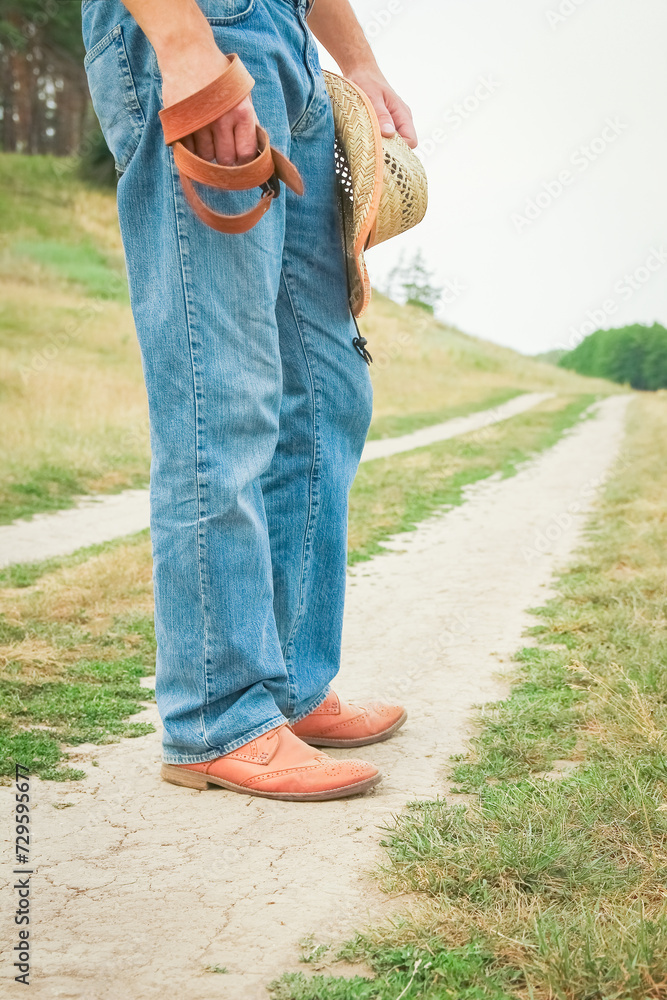 A Cowboy legs in shoes in the park on nature background. The man at the ranch.