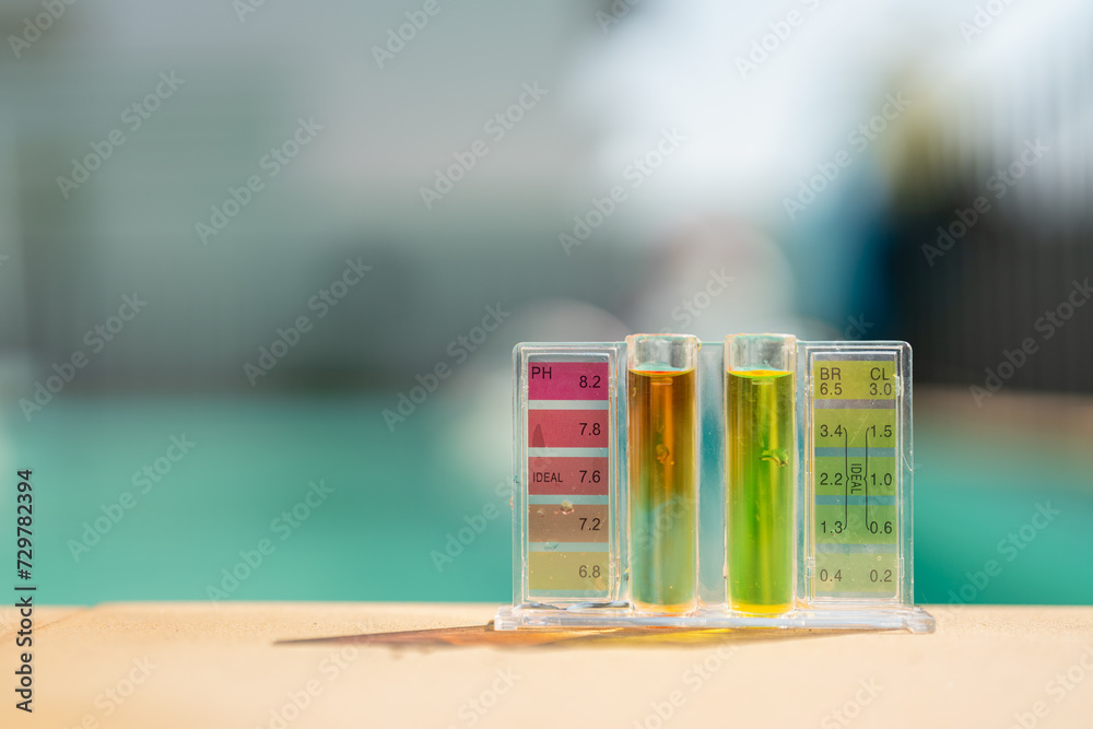 pH and chlorine level chemical droplet test kit for swimming pool service and maintenance equipment object. That place on the edge of swimming pool.