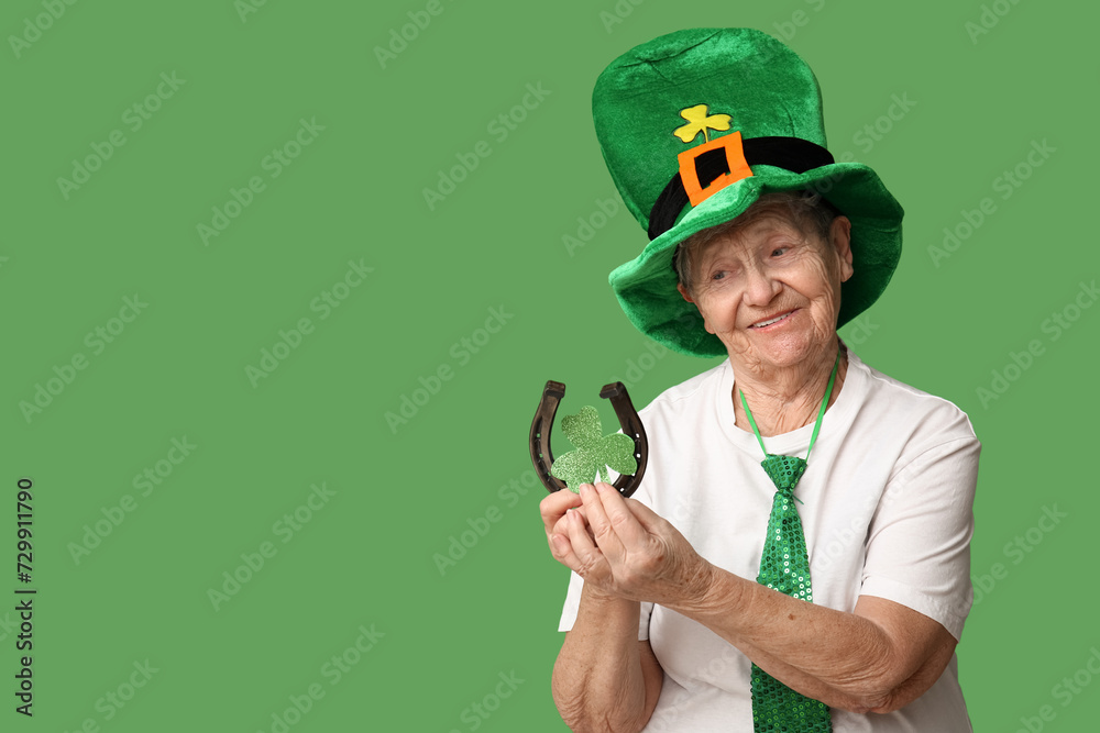 Senior woman in leprechaun hat with horseshoe and clover on green background. St. Patrick's Day celebration