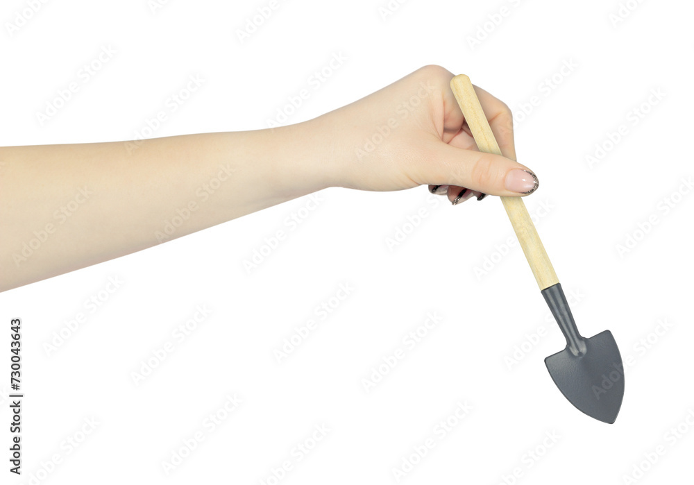 houseplant care shovel in hand, outstretched hand with houseplant care shovel isolated from background