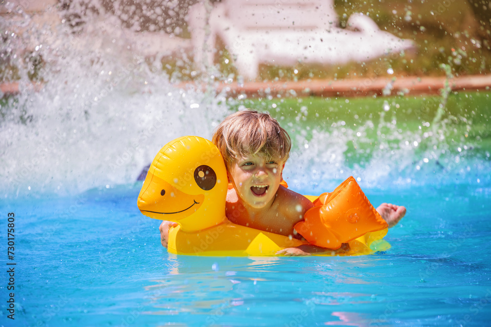 Playful kid on rubber duck enjoys swim and splashing in pool