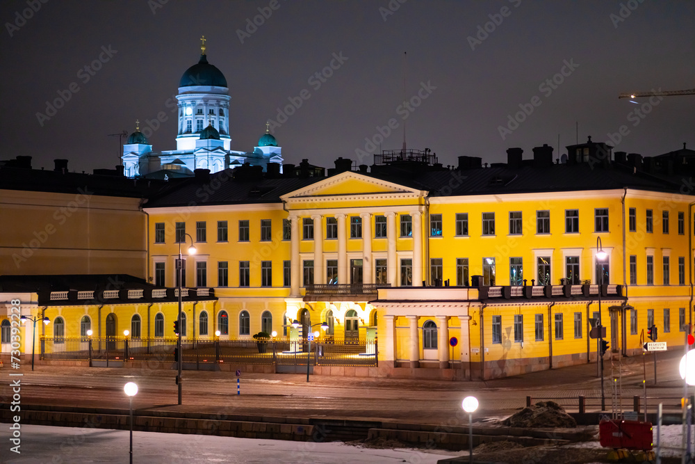 Helsinki Presidential palace during night-time with Helsinki cathedral shining in the background