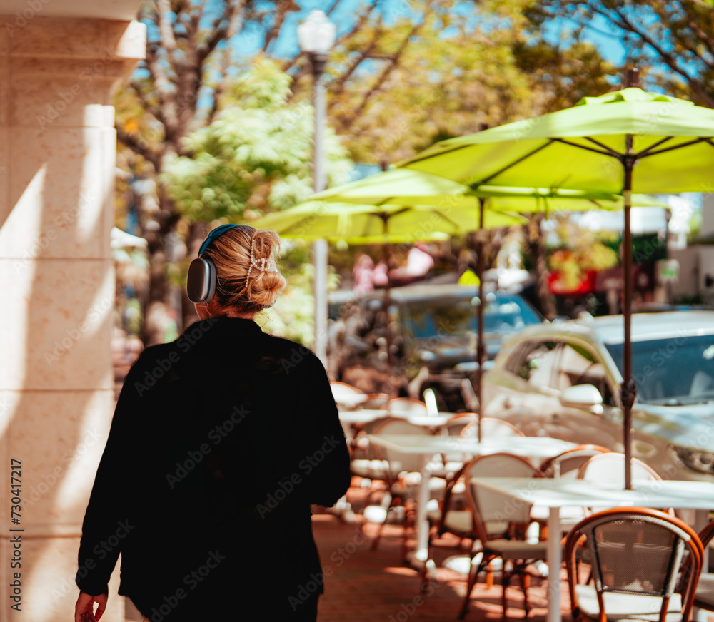 woman walking coconut grove miami listen music