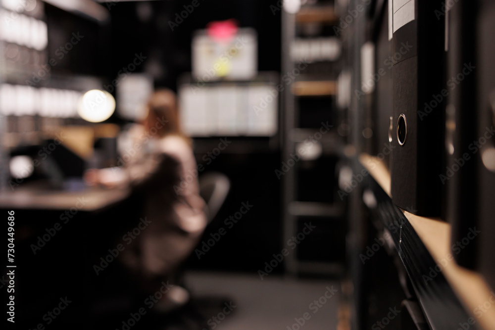 Selectiv focus of metallic storage full with investigation files, in background police officer analyzing crime scene evidence. Private detective working overtime at criminal case in arhive room
