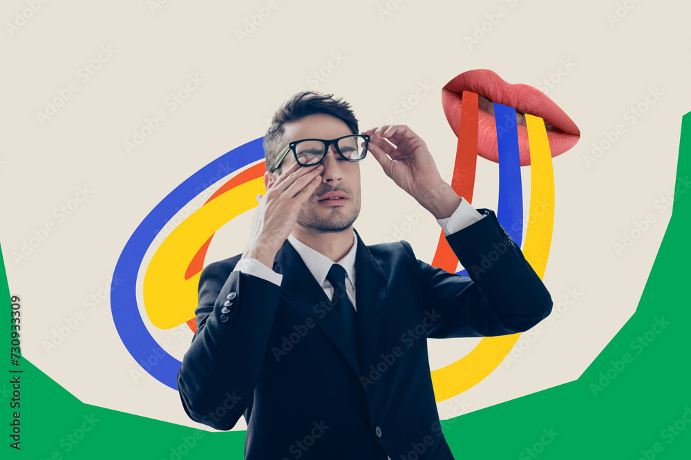 Creative collage picture illustration sad attractive tired young businessman rub eyes director company colorful tape template