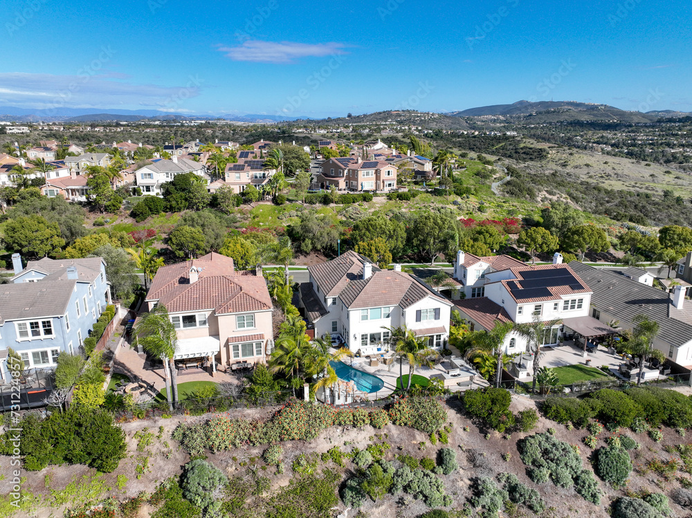 Aerial view of large-scale villa in wealthy residential town of Carlsbad, South California, USA. High quality 4k footage