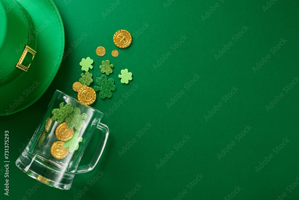 Celtic delight: сelebrating St. Paddy's with joy. Top view shot of blank pint, traditional hat, trefoils, coins on green background with space for congratulations
