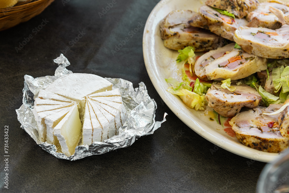 goat cheese cake divided into triangular portions on aluminum or metal foil