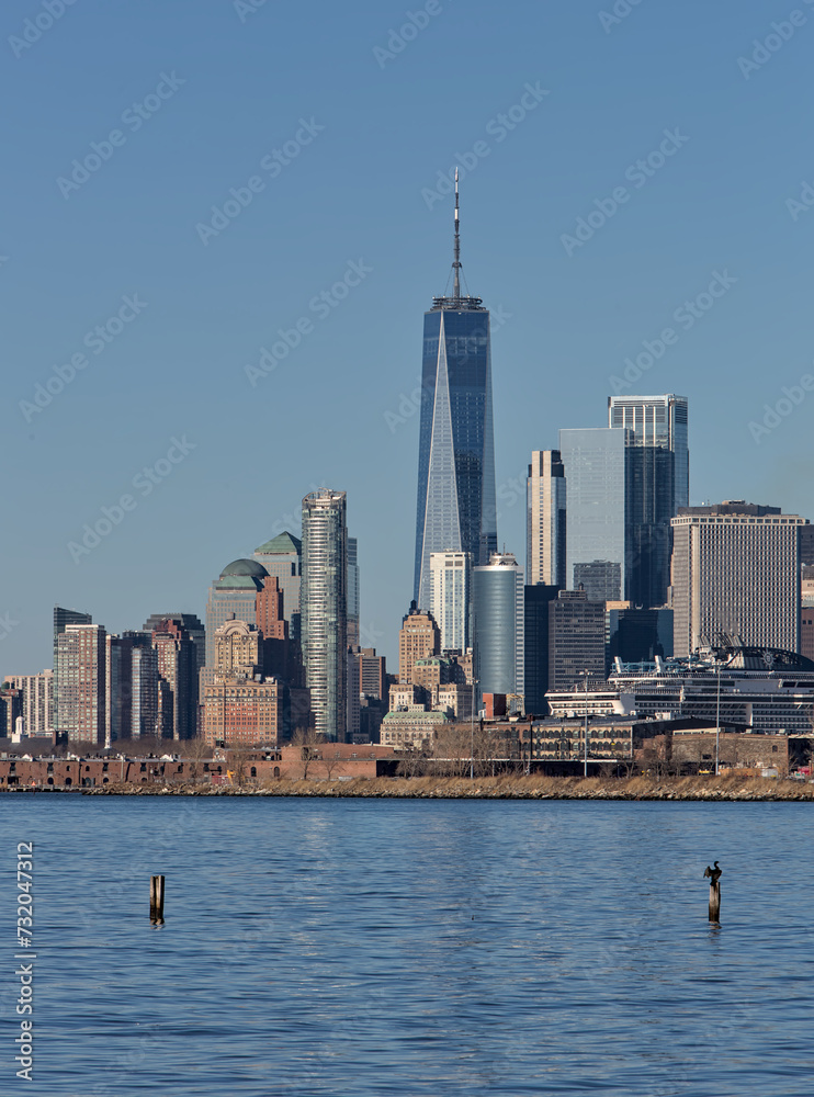 nyc downtown manhattan skyline with barge poles sticking out of the water in the foreground (world trade center skyscraper, financial district) new york city travel destination scenic view