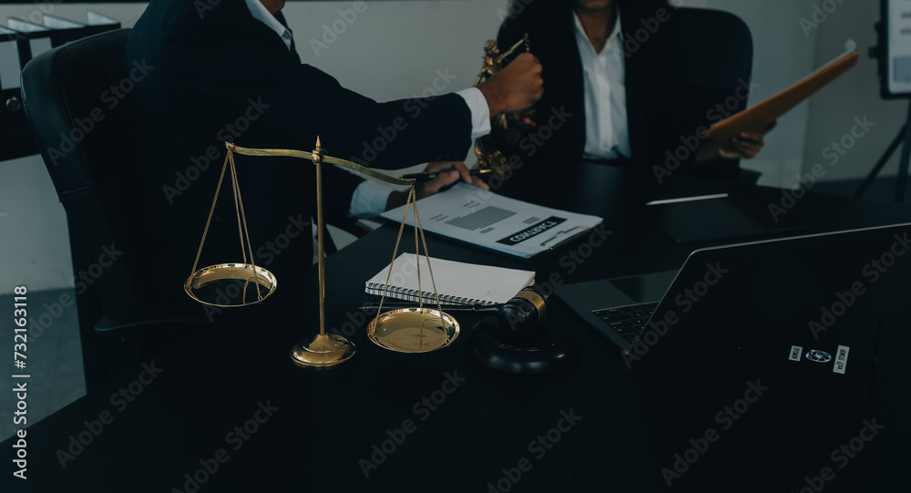 Judge gavel with Justice lawyers having team meeting at law firm background. Concepts of Law and Legal services.