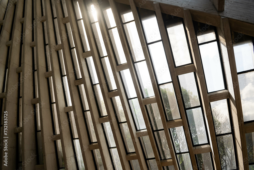 Concrete joists structure with long rectangular vertical windows with black frames. Beautiful view of nature and the sun. Modern architecture with lots of light that invites peace and tranquility.