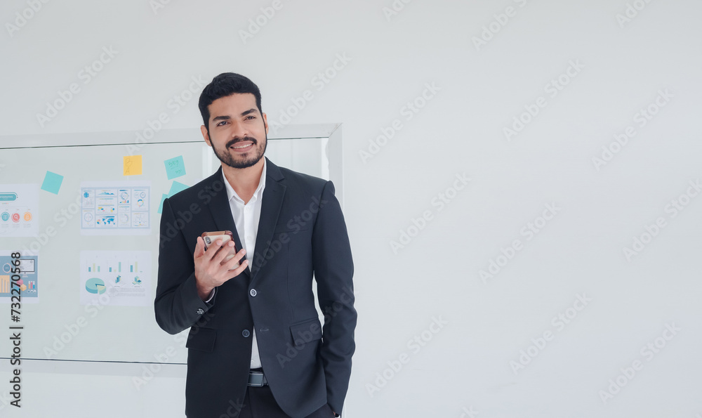 Business man portrait asian one person wearing a black suit handsome standing looking success committed hand holding mobile phone and laptop ready for work inside the office, with white background