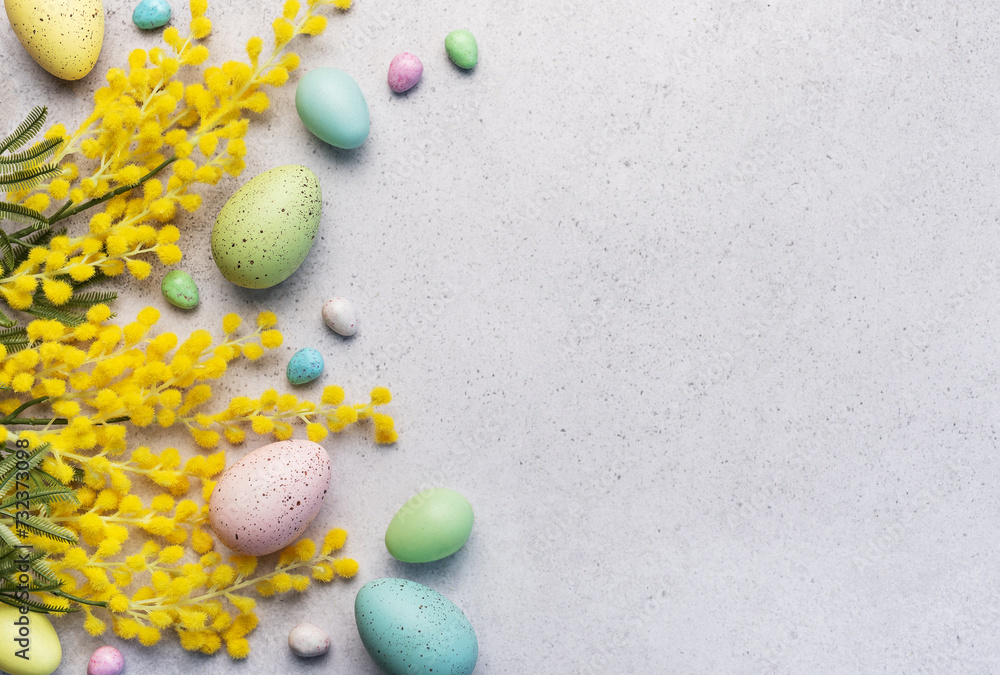 Pastel Easter Eggs and Yellow Mimosa Flowers on a Light Grey Background